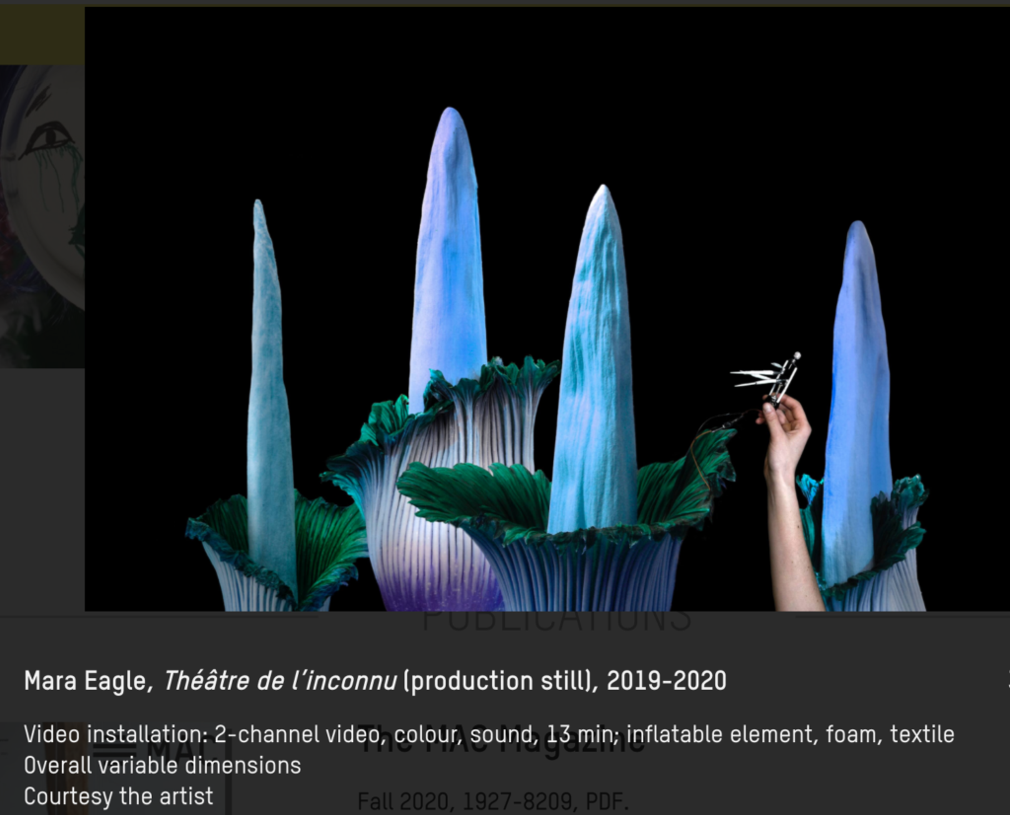 ToftH Artist Fellow Mara Eagle has been selected for a group show opening in January 2021 at the prestigious Musée d’art contemporain (MAC) de Montréal. Eagle’s 13-minute video installation Théâtre de l’inconnu will feature in the MAC’s La machine qui enseignait des airs aux oiseaux until April 2021.